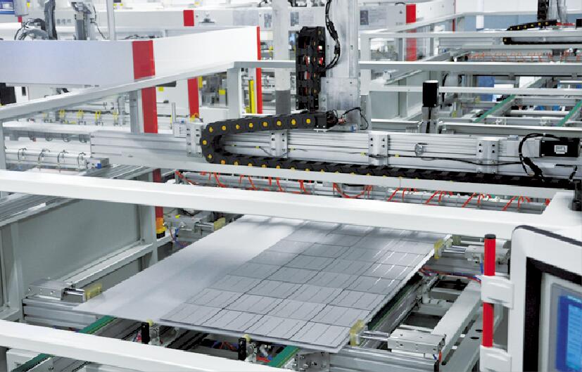 此設(shè)備用于將自動(dòng)串焊機(jī)串焊好的電池串,按照工藝尺寸要求和排版方向順序自動(dòng)排版鋪設(shè)到玻璃/EVA上,組成電池串陣列。玻璃/EVA通過傳輸線傳輸至指定位置,并進(jìn)行機(jī)械定位,四軸機(jī)械手抓取電池串實(shí)現(xiàn)智能相機(jī)檢測(cè)缺陷、定位、自動(dòng)旋轉(zhuǎn)、自動(dòng)排版功能。設(shè)備通過同步帶傳輸與自動(dòng)生產(chǎn)線對(duì)接,實(shí)現(xiàn)了自動(dòng)流水作業(yè)。
